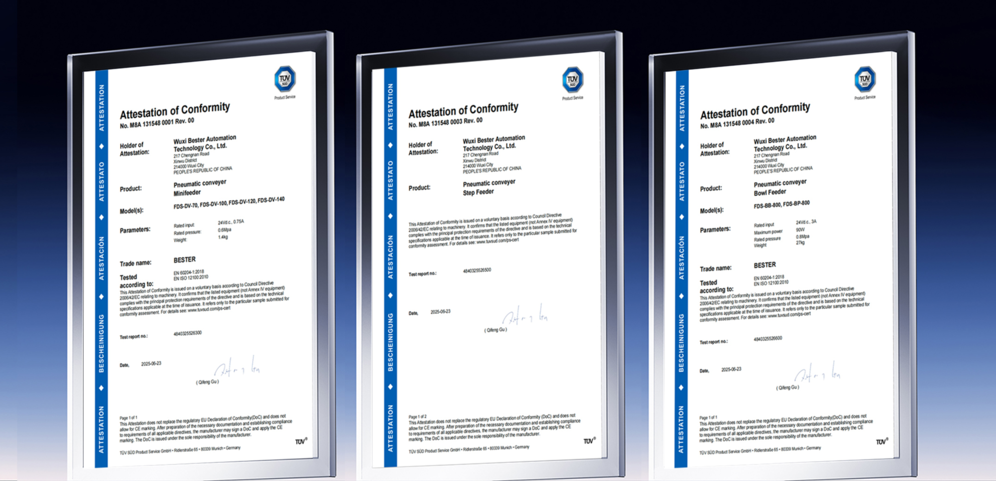 近日,我司旗下送钉机全系列产品,历经严格测试与评估,正式获得欧盟CE认证,取得TÜV莱茵国际权威认证证书。这一突破性进展,不仅是对产品卓越品质与安全性能的国际权威认可,更标志着我们产品在安全、性能及合规性等方面,具备了无障碍进军欧洲及全球高端市场的“通行证”,为全球客户提供“BESTER”(更好的)拧紧解决方案。